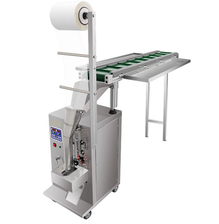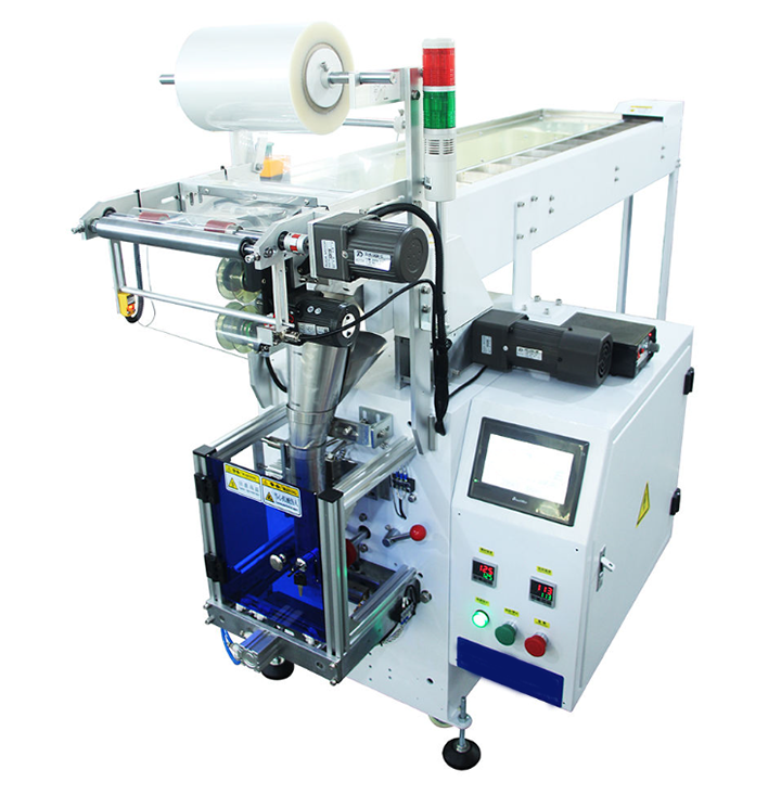 Smaller packaging machines use a short belt conveyor to transport electronic components to the feeding port. The components are then packaged using pre-installed materials, followed by cutting to complete one package. Packaging capacity is approximately 20-40 bags per minute. The machine supports manual adjustment of sealing and cutting parameters and is suitable for factories with limited space.