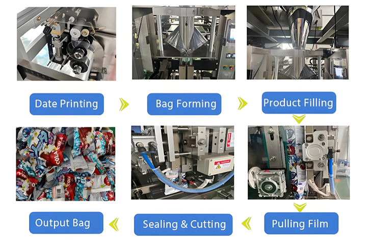 The soft candies enter the hopper of the Fully Automatic Vertical Molding Soft Candy Packaging Machine, where the automatic metering device dispenses them into packaging bags according to a predetermined weight or quantity. The packaging bags are made from roll film or sheet material, stretched and shaped by the machine to wrap the gummy candy product. After entering the cutting stage, the equipment cuts the product to the set length or quantity, and simultaneously seals it using heat-sealing or cold-sealing technology, forming individual complete packaging units.