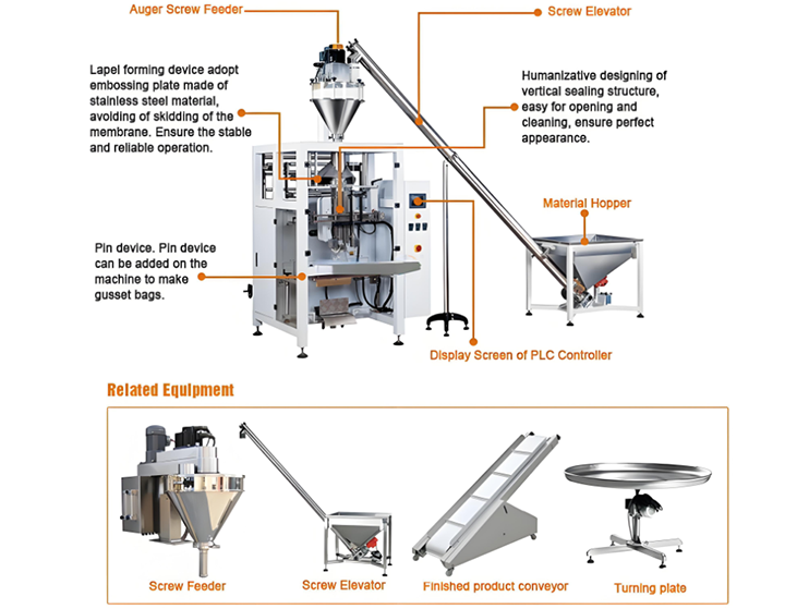 The metering system uses spiral feeding, vibration feeding or vacuum suction technology, combined with high-precision weighing sensors to achieve dynamic metering with an error of ≤±0.5%; the bag-making and filling system automatically makes bags through roll film or docks pre-made bags, combined with spiral, drop or vibration filling methods to achieve rapid filling; the sealing system adopts heat sealing or cold sealing, which provides a firm and beautiful seal and is suitable for packaging films of different materials; the control system is equipped with a PLC+touch screen interface, which is easy to operate, can store multiple recipes, and supports automatic alarm, self-test and other intelligent functions; the finished packaged bags are automatically transported to the coding, inspection or packaging station to realize the linkage of the packaging line.